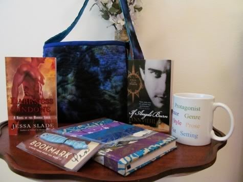 If you'd like to check out Jessa's latest, in comments to this post name an author who you think has mad skills as a storyteller by midnight EST on Saturday, March 10, 2012. I'll draw one name at random from everyone who participates and send the winner an unsigned copy of Darkness Undone by Jessa Slade, a signed copy of my very first Darkyn novel If Angels Burn, a hand-quilted fully reversible Light & Darkness book tote (designed and handmade by yours truly; here's a shot with the reverse side showing), a blue crystal bookmark pen, an eco-friendly blank journal, a writer's words mug from Author Outfitters and some other goodies. This giveaway is open to everyone on the planet, even if you've won something here at PBW in the past.