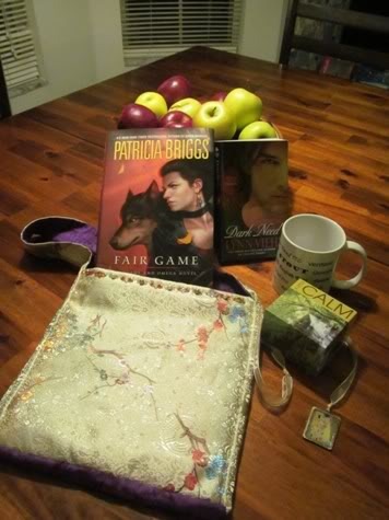 To celebrate Patricia's move to hardcover I have an extra copy of Fair Game to give away. If you'd like to win it, in comments to this post name something you do to reward yourself for hard work (or if you can't think of anything, just toss your name in the hat) by midnight EST on Monday, March 12, 2012. I'll draw one name at random from everyone who participates and send the winner and unsigned hardcover copy of Patricia Brigg's Fair Game, a signed copy of my novel Dark Need, a "Little Calm" mini-kit, a font mug from Author Outfitters, a BookLoop with a miniature of Gustav Klimpt's "The Kiss" along with some other goodies, all neatly stowed in this lovely crystal-beaded tote* handmade by yours truly (please note that the bowl of apples on the table are not included; they're for my kids.) This giveaway is open to everyone on the planet, even if you've won something at PBW in the past.