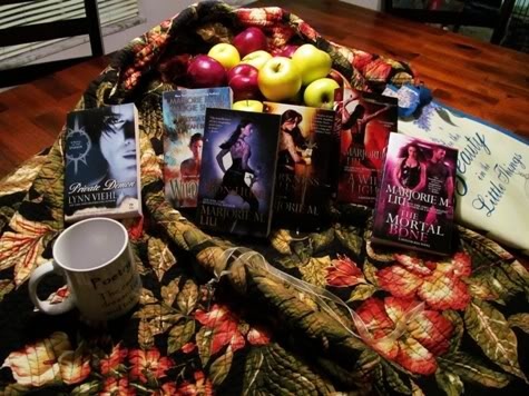 If you'd like to win the lot, in comments to this post name an author or book you've read who has helped you get through the worst of times (or if you can't think of any, just toss your name in the hat) by midnight EST on Tuesday, March 13, 2012. I'll draw one name at random from everyone who participates and send the winner unsigned copies of Marjorie M. Liu's Hunter Kiss series: The Iron Hunt, Darkness Calls, A Wild Light, The Mortal Bone as well as the Wild Things anthology in which the very first Hunter Kiss short story appeared, a signed copy of my novel Private Demon, the beauty in the dark quilt, a Poetry mug from Author Outfitters, a BookLoop with a miniature of Da Vinci's "Mona Lisa" along with some other goodies, all neatly stowed in a "See the Beauty in the Little Things" reusable shopping bag (once again, please note that the bowl of apples on the table are not included; they're for my kids.) This giveaway is open to everyone on the planet, even if you've won something at PBW in the past.