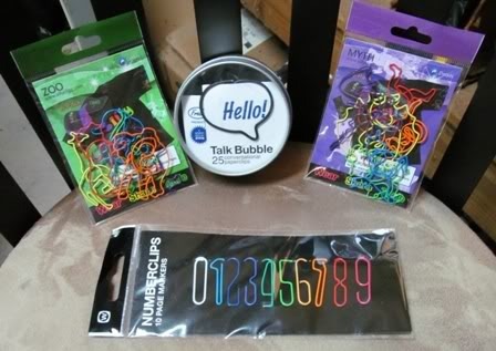 Numberclips are a set of ten page markers that look and function like paperclips but have number shapes from 0 to 9. I found this set at World Market for $5.99.