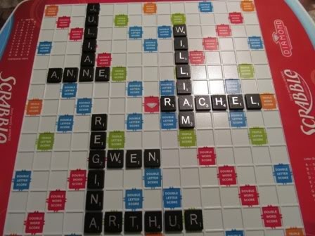 I've been playing Scrabble® since they tried to teach me how to spell in elementary school, and after chess it's my favorite board game. It's an excellent way to spend an unplugged evening with the kids. We regularly have Scrabble® nights here at Casa PBW, and (when I can get a couple of teams together) the occasional Scrabble home tournament. Last weekend Mom and I paired up and kicked everyone's butt all over the board.