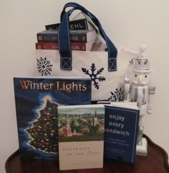 Today I'm putting the final additions in the Let It Snow tote: a trade paperback edition of my Rebecca Kelly novel Portraits of the Past; a hardcover edition of Winter Lights ~ A Season in Poems & Quilts by Anna Grossnickle Hines; and a hardcover copy of Enjoy Every Sandwich by Lee Lipsenthal, M.D. As for the final mystery gift, it's a little something that reminds me of what I found this Christmas, and hope it does the same for the winner.