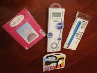 While browsing I found some new widgets at this BAM that weren't at mine: 1. BAM's Bookmark pen, a pen encased in a flat faux alligator bookmark with a small crystal embellishment ($4.99)