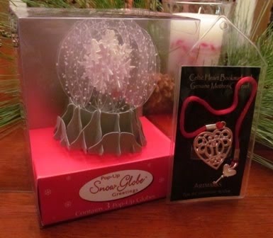 Today after school my daughter and I drove an hour to the largest mall in our area to take care of the last of her holiday shopping. I also made a stop at Barnes & Noble. Since this was probably going to be my last trip there before Christmas I picked up the gift books and magazines I know I probably won't find at one of the smaller book stores closer to home. Then I just browsed with the kid and watched her pick up things at random. Here are two of my teen's gift purchases that I thought were neat: A set of absolutely gorgeous pop-up Snow Globe Greeting cards by Up with Paper ($14.95 for a set of three, and the price did made me wince until she pointed out that we spend that much on flat Hallmark cards, while these turn into dimensional art.) She also found a Cynthia Gale/Artmarks metal, satin cord and mother-of-pearl Bookmark in a Celtic Heart design with a tiny key ($6.95); quite elegant and the perfect gift for any passionate reader.
