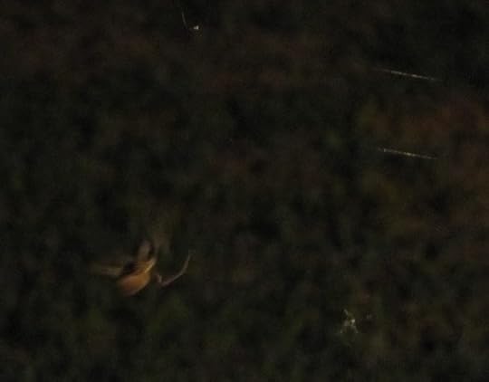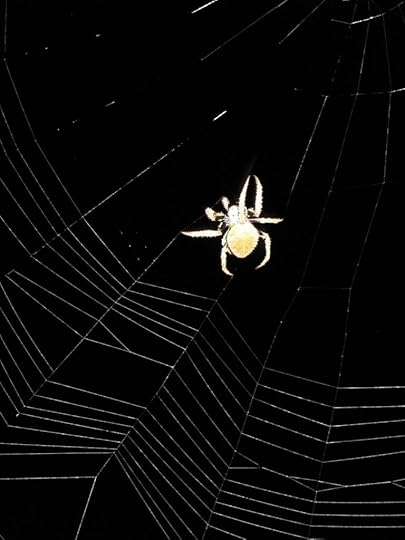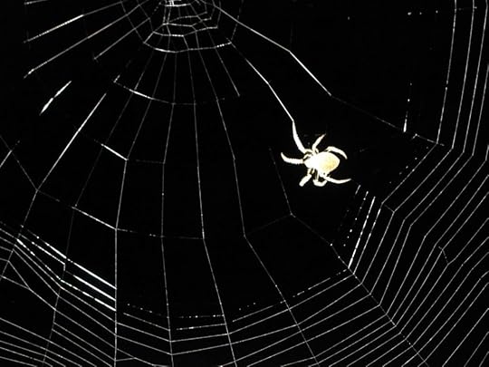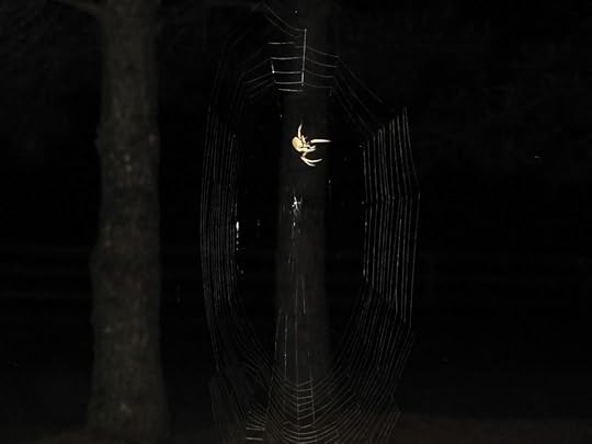 As my guy walks through that part of the yard every night he was not happy about the spider occupying it. He wanted to kill it and tear down the web, but I persuaded him not to. Once they move into a yard, these orb weavers build their webs in the virtually same spot, so we would now know where to watch out for her. Even though we didn't recognize her species, I thought for sure by morning she would be gone, too -- and sure enough, when he took the dogs out this morning, both spider and web had vanished.