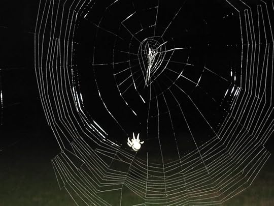 Several varieties of orb weavers come out only after dark to make one-night stand webs. As soon as the sun goes down they pick a spot and go to work, and within a couple of hours have a web in place. Their webs are huge, easily four to six feet in diameter, with anchoring threads that can stretch up to fifty feet. Yet by morning the spiders are gone -- and so are the webs they build.