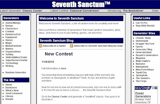 My oldest online break room is Seventh Sanctum, where there is a generator for just about everything an RPGer or storyteller could want. Much of what I generate is tongue-in-cheek stuff, but often I find bits and pieces I can recombine and mortar together into new story concepts, character profiles, plotlines and so forth. SS also reminds me not to take myself too seriously or slip into the blues, something I've really needed lately.