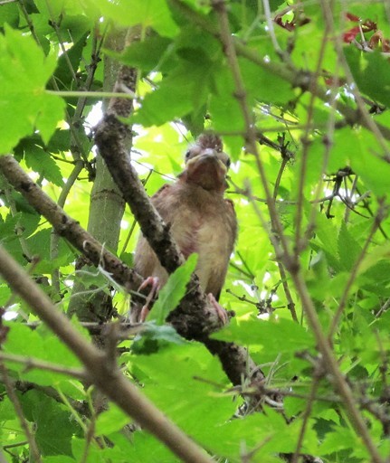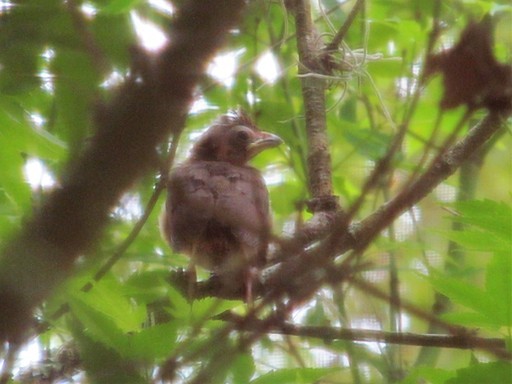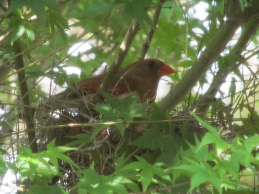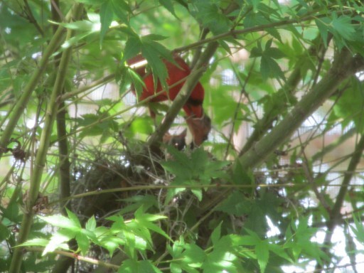 Every day has been bird watching day here as the baby cardinals continue to grow. Mama spends most of her time bringing them bugs and worms and keeping a sharp eye on the nest; to keep from scaring her off I shot this on zoom through the porch screen: