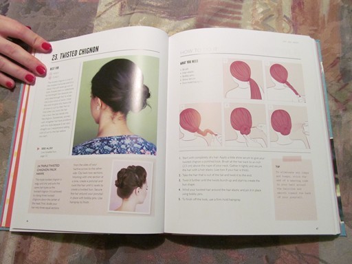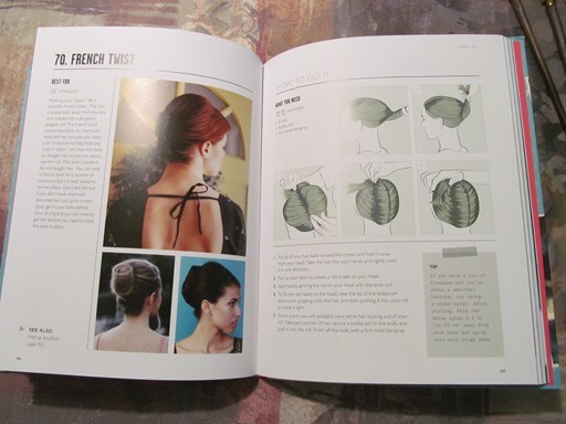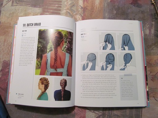 First, some thoughts on the book itself: it's very well written, beautifully photographed, and offers many style variations. The models used for the styles are of a nice mix of ages, hair colors and hair types as well, including some African American, Asian and Latina ladies. I really liked that ethnic hair types were well-represented in the book, as we all know that not everyone is born a California blonde. The instructions are grouped in five chapters by style type: casual, out and about, sporty, dress up and extra special. There's also a whole chapter at the end, Problems and Solutions, to help the reader trouble-shoot, fix and maintain a healthy head of hair.