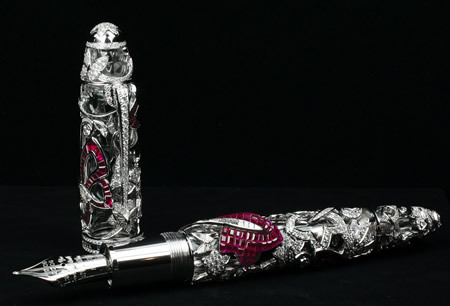 According to The Top Ten Most Expensive Pens in the World, "The Limited Edition Mystery Masterpiece, a joint creation between Mont blanc and Van Cleef & Arpels, is the most expensive writing pen ever created." I don't think I'd spend $730,000 for something someone could swipe so easily, but when you look at it you have to wonder how it would feel to try to write with such a lumpy/bumpy object.