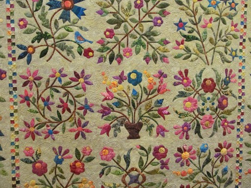 So many amazing quilts were entered I practically burned up the camera snapping pics. Among the surprises, there were lots of dimensional quilts with objects couched right on, or faux 3-D appliques artfully. Think a butterfly quilt with the butterflies rising out of the quilt as if they mean to fly off, and you'll get the idea. Adult coloring books have also invaded quiltworld, as they influenced one entrant to design and make an adorable elephant wall hanging based on the bright coloring style of the books. After all the fun I had with the Barcelona coloring book I might have to do something like that.