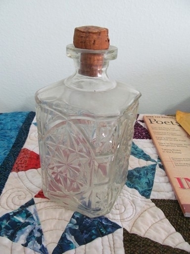 We don't drink, so it definitely wasn't ours. I did a little research and found out it's a pressed glass liquor bottle from a manufacturer in Puerto Rico, and was once possibly filled with rum. I doubt it's valuable -- I seem to remember my parents having bottles like these back in the seventies -- but it is interesting to see that it was hidden in the very back of a cabinet. Perhaps a previous occupant was indulging on the sly? If that's the case someone would have had to use a ladder or climb onto the counter to reach it. But what if it was hidden for another reason?