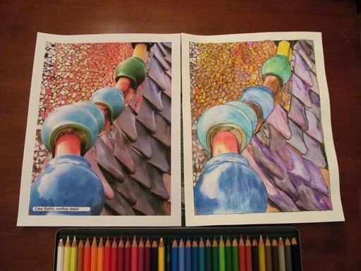 I employed standard color pencils to tackle this very detailed window scene, but because I can't apply a lot of pressure with my fingers without pain the colors came out lighter than I wanted.