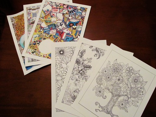 I received the review copy in .pdf format, and selected three pages from the twenty-four in the book to color, which I printed out on basic white cardstock. From the first page I worked on I found myself almost immediately calmed and startlingly clear-headed. I stopped thinking about anything but the colors to chose and the sections to work on. It's the strangest thing, too, because I never stop thinking like that, even when I'm sewing. Once I realized what the effect was, I tried to think of something while I was coloring. Within a few minutes my thoughts drifted off and I once more became immersed in the simplicity of the coloring.