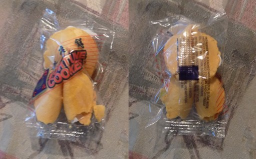 That's not one but two fortune cookies in the same package. I debated on whether to open it or save it as an oddity, and then I just caved today and opened it up: