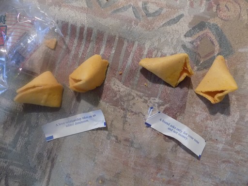 There were two complete cookies inside, and each one had a fortune. Since I usually get the grim, stern-sounding fortunes I braced myself, but each one was kinda nice: "A love relationship takes on an added dimension" and "A friend asks only for your time and not money." Since both already came true it's also a little creepy, but there you go.