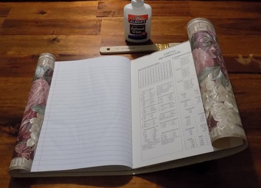 I liked how elegant the composition book looks now, and it's certainly sturdier. I was especially happy to finally use that wallpaper border remnant, which is one I found when we moved into this house (the previous owner's wife had them decorating the ceilings in practically every room.) I also didn't have to cut the wallpaper to fit; it was the perfect size for the covers.