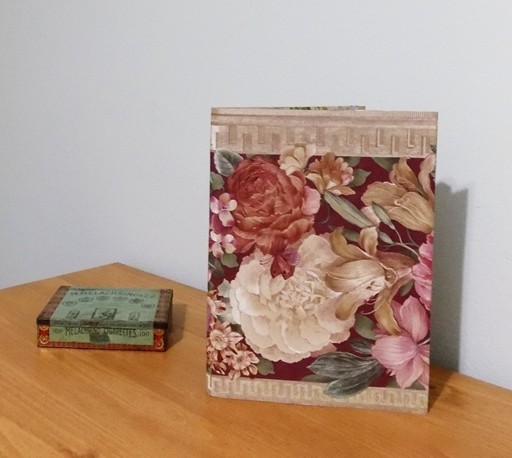 I fit the wallpaper border remnant as the outside cover for both the front and back covers, and folded the ends over inside before I glued that on and left it to dry overnight: