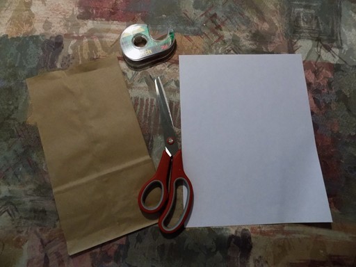 For this project you will need a small brown paper bag, a sheet of white paper, tape, and scissors. Some optional items to use: double-stick tape, glue, stapler, old flat Christmas ornament or a small candy cane. I got this bag when I bought some cards at the market: