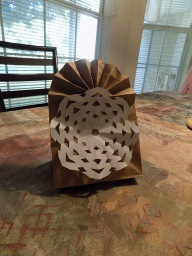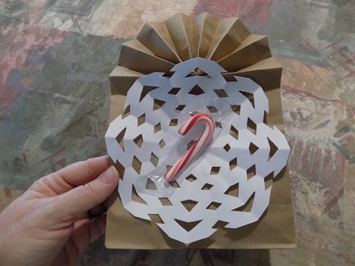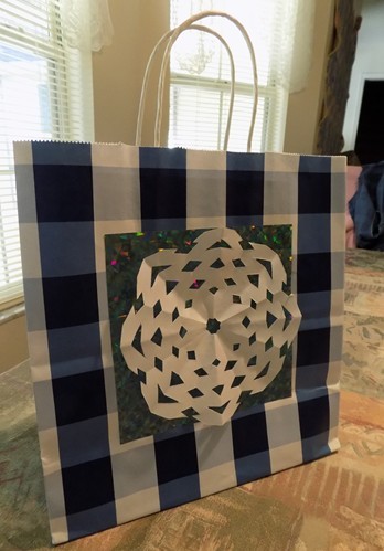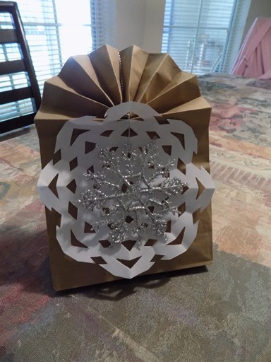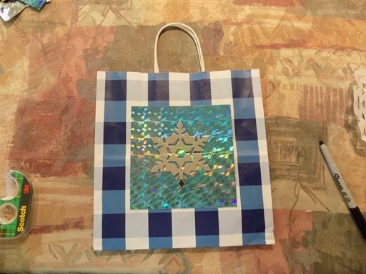 Cut a snowflake out of your white paper (if you don't know how, Martha Stewart has a photo gallery with simple instructions here) and tape (or glue) to the front of your bag: