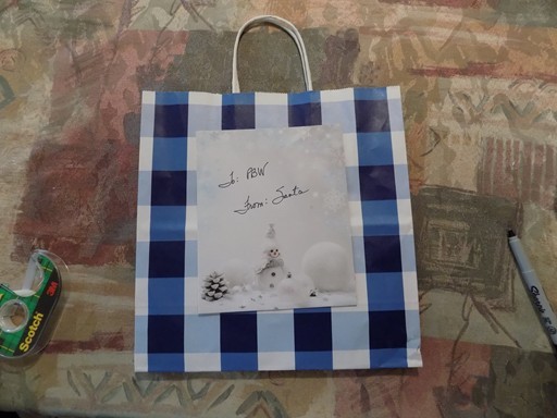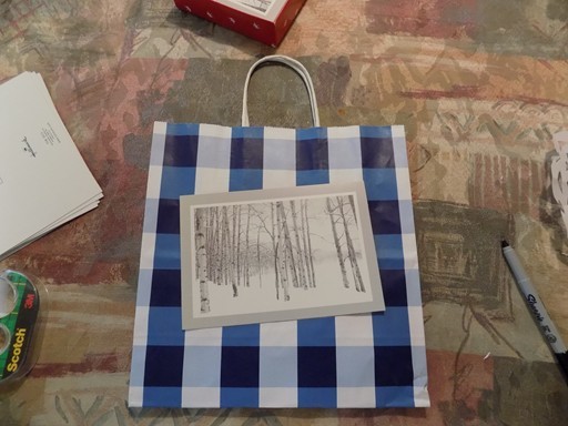 All you have to do with a store bag like this is cover up the logo with a seasonal image that has matching or complimentary colors. Here's a pic I printed out, trimmed, taped over the logo and also used it as the gift tag: