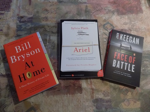 Hooray! I have read the Bill Bryson, but someone nicked my copy. I was planning to buy another to add to my Bryson keeper shelf, so very pleased to have it so I can read it again. Back when I was in high school Sylvia Plath was my favorite poet (big surprise there, eh?) and I bought the edited/censored edition of Ariel, which is now too old to handle. I'm anxious both to reread it and see what's in the restored edition. I've read several of John Keegan's books -- he's an amazing nonfic military writer -- but not this one. All three books are perfect choices for me.
