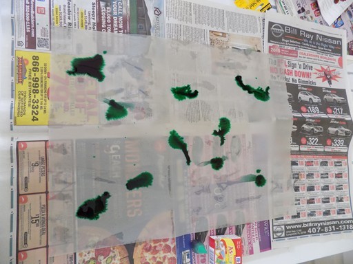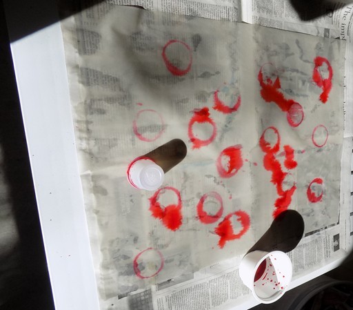 For this you will liquid food coloring, water, and (optional) an old clean sponge, and a small plastic cup. First, spread out some old newspaper to protect your work area. Since we'll be using food coloring to dye the paper, you may also want to put down some plastic or protective sheeting under the newspaper to prevent the colors from bleeding through the paper and staining your surface (I used the old metal table on our porch as my work surface, as it can't be stained.)