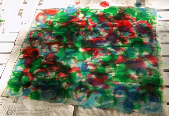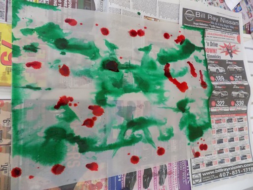 As you work the colors are going to spread like watercolor paint. Now add a third color. If you want more control over where the color goes on the paper, apply with a sponge, as I did here with the blue:
