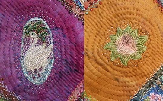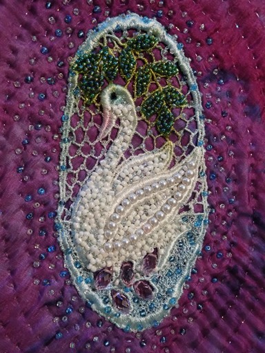 I've had this swan lace applique for a while, and couldn't figure out how to use it. Finally I just sat down and made it a center motif, and let the subtle colors in it inspire the embellishment beading: