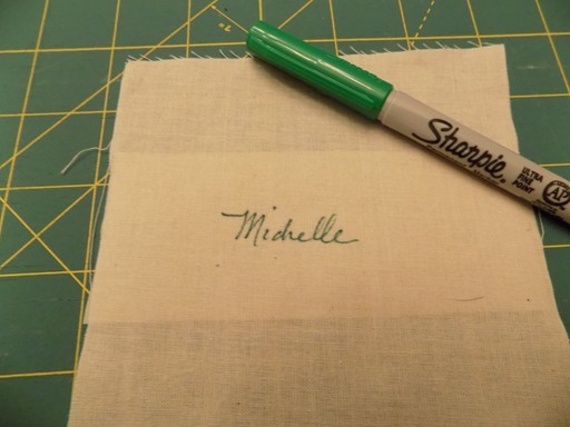 The masking tape is an old quilter's trick to temporarily stabilize the muslin so you can write on it like paper. Once you're finished writing, remove the tape, and stack a square of your print fabric on top of it so the name and the right side of the print are inside: