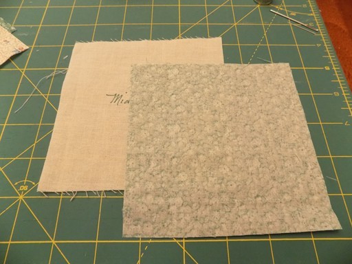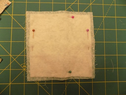 Place a square of muslin or a stacking of dryer sheets on top of your two squares and pin together: