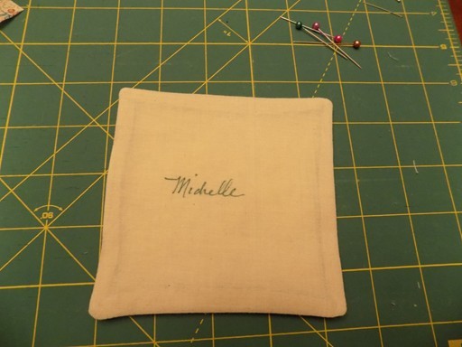 Press all your cloth scraps, and cut the prints and muslin scraps into the size coaster tag you want plus one half inch (so to make a five inch square coaster tag, you'd cut your fabric into 5-1/2" squares.) Cut your batting or a stack of dryer sheets into the exact size of the coaster you want. Place a piece of masking tape across the center on the back of your muslin (like this), turn it over and write the name of your recipient on the front with your marker: