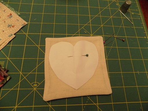 Sew closed the turning gap with a blind stitch, cut a heart shape to fit inside the coaster out of your notepaper, and pin the heart to the coaster:
