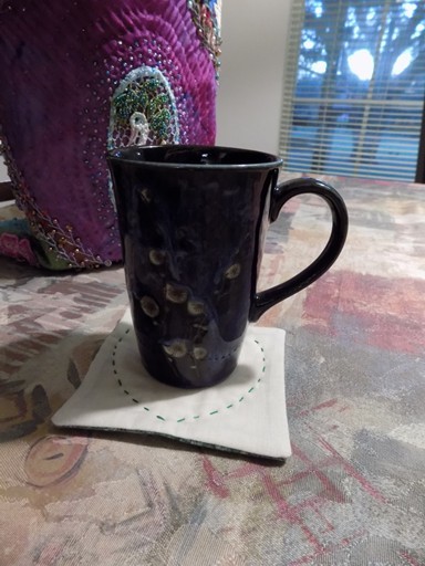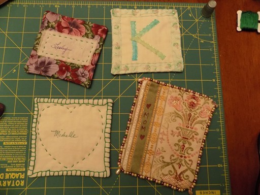 Some tips: Keep all your beading and raised embellishments on the outside edges of the tag so the center remains flat enough to place a cup on later. You don't have to write names on your tags, you can use an initial (like my K coaster above) or something else that identifies your recipient. One quilter I know makes fabric photo Christmas ornaments like this and uses them as gift tags first.