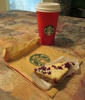 I look forward to my cranberry bliss bar because it's one of my just-for-me holiday traditions. Also, it's delicious. I bring it home and sit on my porch while I nibble away and enjoy every bite. I also have a vanilla latte with it, as that's my favorite Starbucks drink, and the two go great together. Having this treat always gets me in the spirit of things. I don't know why; maybe it's the cranberries. I don't feel guilty for this one little indulgence every winter, either (if you don't understand why, give up sugar for seven years.)