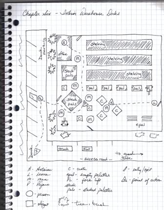 Naturally your story settings don't have to be based on actual locations (would have been tough for me to do that with StarDoc), but it helps to have some knowledge of a real-world counterpart when you're working in a fictional location. This map I drew of the warehouse I used for a few scenes in Nightborn was not entirely invented; many of the interior features came from my memories of a warehouse belonging to a paper distributor that I once worked for about twenty years ago. That knowledge of the physical features helped me better choreograph the scene because I remembered what was inside, how the shelving and equipment looked, the sort of obstacles they'd create, etc.