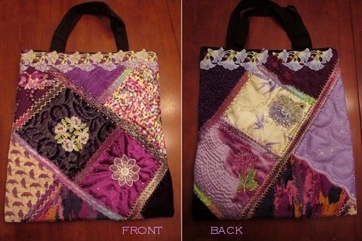 I've been working for a few weeks now on this tote, which will be a holiday gift for the mother of a family friend who admired my needlework. When I began this project all I really had to go on was the mom's favorite color (purple), fabrics, laces and ribbons I bought from FancyCrazys, RavioleeDreams, and AbbyandEllie on Etsy, and some vague ideas on what I wanted to do.