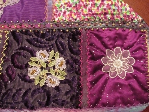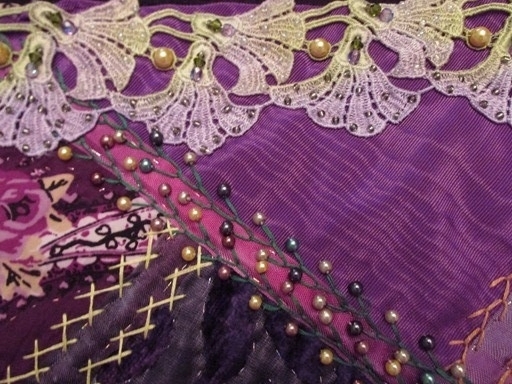 I gave myself permission to do whatever I liked without worrying about rules, traditions, or what I've seen others do with their crazy quilting. Some of my ideas came out well and added to the experience library in my head. Others didn't translate the way I envisioned them, but that also helped me learn. I don't think I'll ever master a perfectly even herringbone stitch, or make a seed-beaded cretan stitch look like anything but an ornate zipper, but I will keep practicing and trying new approaches.