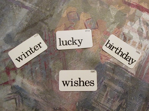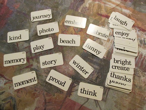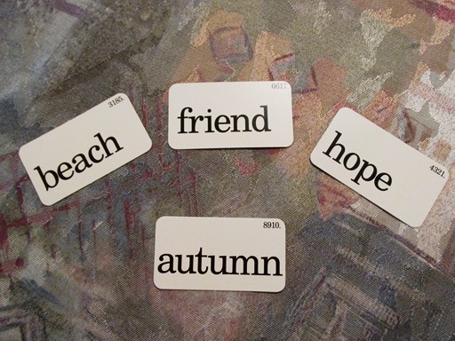 I bought them because I love all things idea-ology, and I thought they might be useful as story prompts, too. The deck contains 72 1.5" X 2.5" cards with thematic words on both sides: