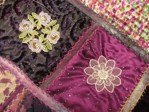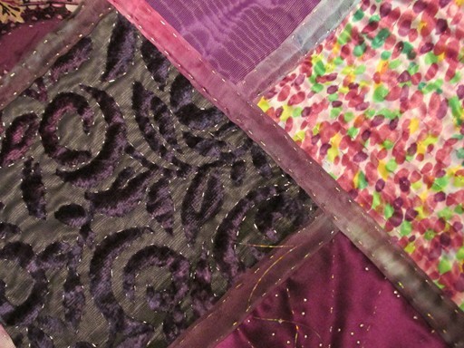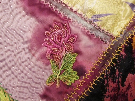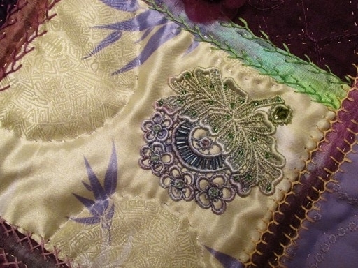 I'm nearly finished a holiday gift project that I started when I finished the tropical quilt, and for once I'm trying to edit myself a little more with the embellishments. Curbing my enthusiasm for beading and lace helps prevent the stitchwork from getting buried. For example, one panel ready for embellishment started out looking like this: