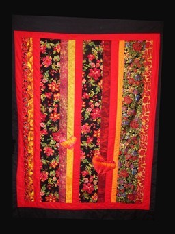 My first major art project this year is this lap quilt I put together from some random red and gold fabrics in my scrapbag. I also used some black broadcloth leftover from the MegaCon booth drapes last year as the backing and sashing, and simply strip-pieced the patchwork to create long straight lines for me to hand quilt.I haven't made a quilt since my eye surgery, and I've missed sewing. I'm also seeing some of my quilter pals this month for our annual in-person get together, and I didn't want to say I'm still on hiatus while they talk about all the projects they've finished (we're not really competitive, but I wanted to have one good story.) After struggling with beading and sewing on some tote projects this winter I knew in advance my needlework would probably suck, though. With my flip-flopped vision I can pick out a stray thread hanging from across the room, but it now takes me about ten tries to thread the eye of a quilting needle.