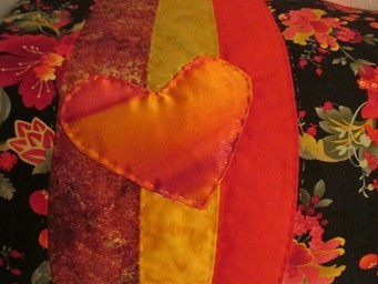 But I didn't. I believe in falling up, not down. As in, if you can't learn from your mistakes you'll never improve. Finishing the ripped-up holey quilt took me two months. I spent a couple of hours almost every night stitching up and down. I quilted over the hole and the rips and tried some different threads to see if anything would be a little easier for stitch practice (and weirdly enough, rayon thread turned out to better than glace or waxed for me.) Once I finished the piece I looked at the damaged spots in the fabric and decided to cover them both with with the strategic placement of two heart appliques. Sappy, I know, but by then I had worked through my frustration and come out the other side with my love of quilting intact -- and maybe more balanced.