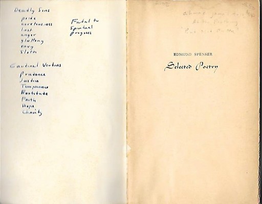 Sometimes I find notes in books that really intrigue me, such as those I discovered when I purchased a 1958 edition of Edmund Spenser's poetry. Inside the front cover some reader before me wrote this: