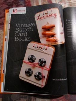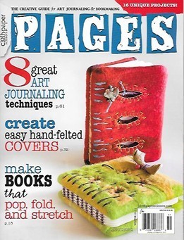 Because I'm a nut about old sewing notions I have a substantial amount of old buttons cards that I've never done anything with, and in this issue Mandy Russell shows you how to use them as covers for wee journals. The artist does use a Coptic stitch to bind the journals, so it's a bit more advanced in the technique department, but she has excellent directions and a couple of stitching illustrations to show you how to manage the binding. The scary project was one that involved cutting up and weaving strips from aluminum cans to make journal covers; while I appreciate the recycling aspect it definitely looked like an exercise in slicing your fingers to pieces. If you can't resist that one I advise you proceed with extreme caution and make sure your tentanus shot is current.I did feel this issue is a bit light on new ideas, and I get the feeling Pages may be heading in another direction now. I really liked this magazine because it started out genuinely invested in real, creative book-making. In this issue I do see some signs (the results of a subscriber challenge, making your own "cozy journaling corner") that it could be evolving into another Butterfly people rag (and Lord, don't read the article about the scroll journal in this issue unless you want to cry all morning.) If the next edition is more of the same I think I might have to move on, but I'm hoping it won't be.