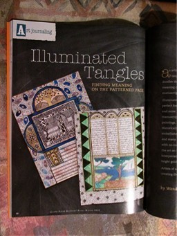 It's an okay issue for the most part. This time nearly all the projects were fairly standard book-type journals (as opposed to past issues that explored making a journal out of a paintbrush, a fake piece of fruit, etc.), which will appeal to the traditionalists. I did like the Illuminated Tangles page project by Wendy Currier and Marcia Thornton Jones, which is a kind of fusion between Zentangle-type doodling and illuminated manuscript techniques. The steps of the project are explained very well, and the results are impressive. It's also a project basically anyone can do.The techniques in this issue ranged from interesting to useful to scary. Making a book you don't have to sew or glue and assembling a simple pop-up were likely the best of the lot. Watercolor travel journalers will really love the piece on visual fieldnotes, while those of you who are interesting in less traditional journals will enjoy the project on deconstructed journaling. There are also some stunning journal pages showcased in the back of the issue that look as if they've traveled through time.