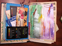 Now if I've filched the Blogger links and recoded them correctly, this post should show three pics from my summer art journal. I've gotten back into sketching, drawing, painting and collaging in a small way, mainly to refine my motor skills now that I've got more control over my alternate index finger (aka my middle finger -- arthritis has toasted the joints of my official index finger.)I've also missed my journaling art. I love to sew, and quilting will likely be my primary art-for-fun forever, but sometimes I need a break from the needlework. Having an art journal allows me to play with color and ideas, and express my POV in interesting ways. Over the years I've also collected a massive amount of images, interesting papers, and recycled materials, and working them into art makes me happy while being green. I've also missed painting watercolors, terrible as mine always tend to turn out. It's not the final product that really matters anyway for me; it's the making of it.