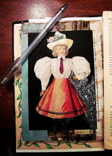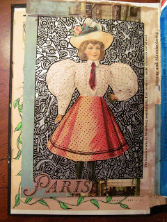 As with my experience with adult coloring books keeping an art journal is very soothing. I do write in mine, but not much (and taking a little rest from words is likewise calming and relaxing.) Since it's usually a negative mood changer I have been working on a couple of pages almost every day while moving my youngest off to college. I find I prefer to end my day with art journaling because it works out all the snarls and worries from my thoughts, and allows me to sleep better once I do go to bed. Because I do it just for fun there's no pressure. I don't have to be profound or say things important or even think about it much. I let my ideas loose and see what happens.Combining collage with doodling is my favorite form of art journaling. Here I put together a pretty little Victorian paper doll I've had sitting in a drawer for years on a recycled bit of black card stock, and used a silver gel pen to doodle around her. Since one of her feet had been torn off I added a clip of the word Paris from another paper remnant to cover the amputation. The end result (see next photo) might look a bit wonky, but I liked it -- and with journaling of any kind that's all that matters.