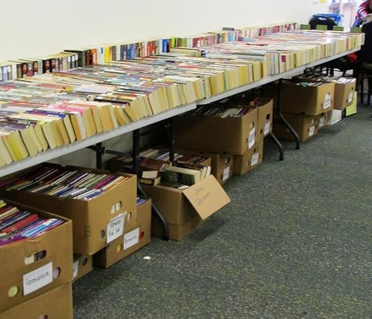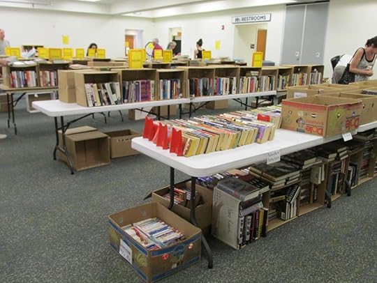My reading habit is usually heavier than my wallet, so when my new book budget for the month runs out I'll hit flea markets, rummage sales and used book stores to browse for bargains. I also like to stop in public libraries and see what books they're selling (usually offered by friends of the library in some shelves upfront or a separate room), and I make a point to always go to library book sales, like this one: