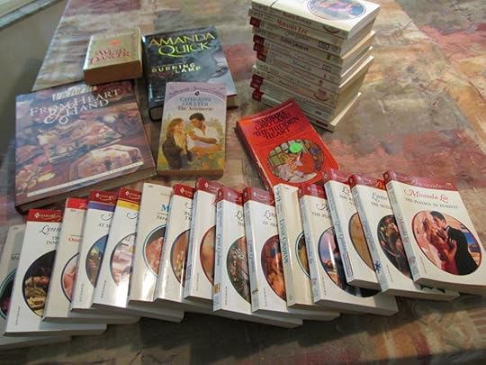 I picked up two hardcovers -- an Amanda Quick for my friend Jill and a keepsake how-to by Victoria magazine -- as well as three rare old paperbacks I'd read way back in my teens and twenties. I also scored 27 HPs, most by two writers I like and a copy of a Robyn Donald favorite to serve as a lender. Retail for all these books new would have been in the neighborhood of $175.00; even at the Dollar store they would have cost me $32.00. At the library sale I paid $4.95 for the entire pile, or about fifteen cents a book. All profits from the sale go directly to support the library, too. When I'm done reading the books I bought I will pass along the best to friends and then donate the rest back to the library, perhaps to be sold again at another library book sale in the future.