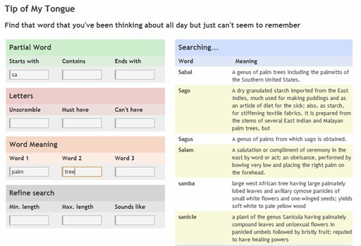 Tip of My Tongue is one of those little online tools that is insanely helpful when you need a word but you can't remember exactly what it is. You feed it what you can remember: letters, partial fragments of the word, the meaning, what it sounds like etc., and it searches for word matches and produces a list of possibilities.